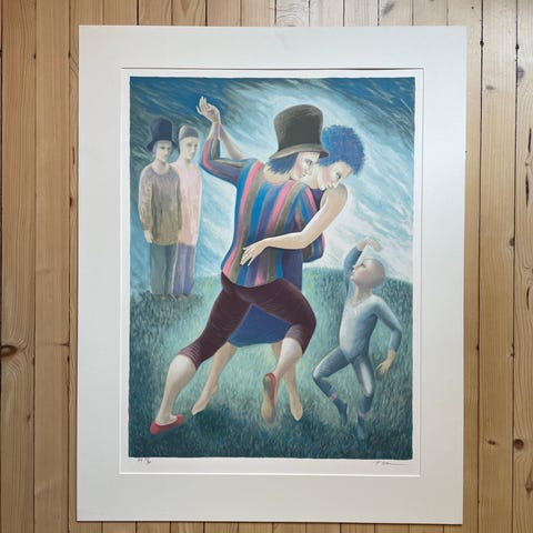 Linosnitt i sort/hvitt signert kunstner Aud Powelson (1942 - 2021). Dette trykket bærer tittelen "The homemaker."