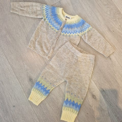 Hand strike ullklær for barn i størrelse 86, i fargen grå. Laget av merinoull, egnet for både gutter og jenter. Settet inkluderer genser, bukse og lue, designet for å gi varme og komfort.