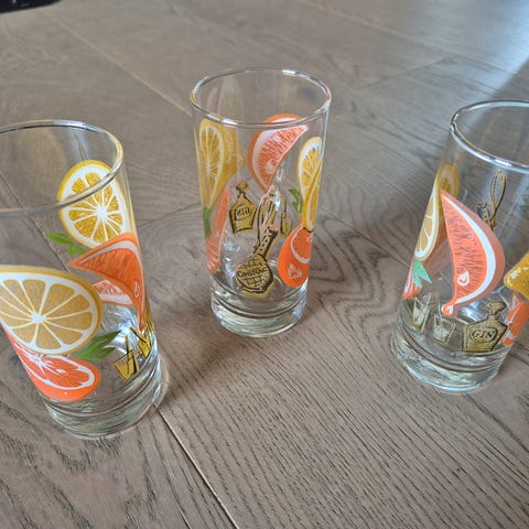 10 stk flotte longdrinkglass. Finner ikke merket. De er 18 cm høye, bunnen er 4 cm tykk og de er 6 cm i diameter. God tyngde på dem. Kan sendes. Kjøper betaler porto.