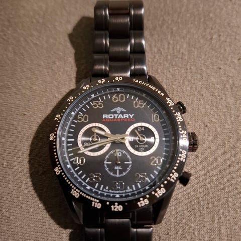 Reward VIP herreklokke i svart stål med flere funksjoner inkludert kronograf og datovisning. Klokken har en svart urskive med roségullfargede detaljer og en tachymeter på bezelen. Den har en robust lenke i svart metall og et klassisk design egnet for hverdagsbruk.
