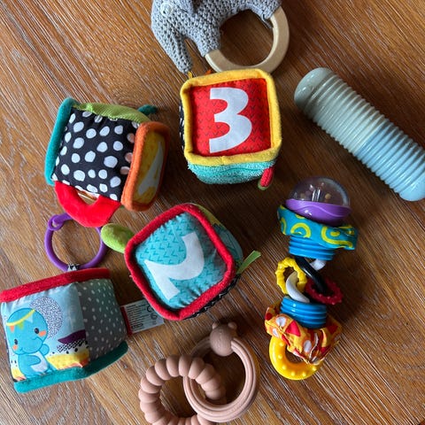 Pakke med babyleker med to kosekluter, to leker, en rangle og et pledd fra Princess på 70 x 100 laget av bomull
