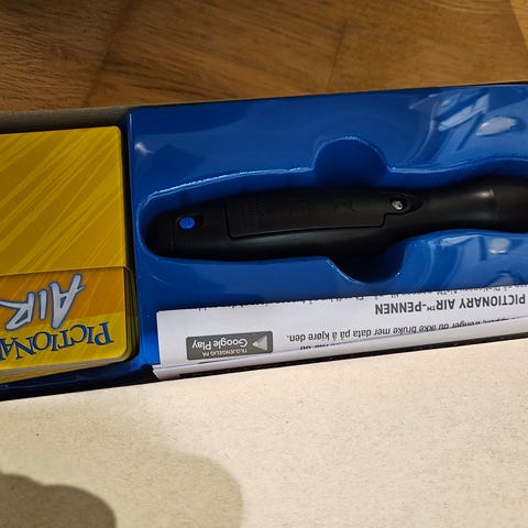 Pictionary Air familiespill med penn og digital tegning. Spillet gjør det mulig å tegne i luften med en spesiell penn, og tegningene vises på en tilkoblet skjerm via app. Passer for familiebruk og sosiale sammenkomster. Inkluderer 1 penn og instruksjoner for bruk med TV eller digital enhet.