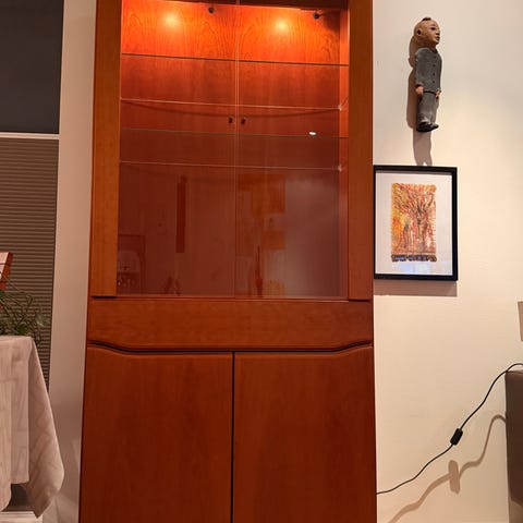 Dette er et godt, stort skap fra Hødnebø Madla, som ikke lenger eksisterer. Skapet har et unikt design og er av skikkelig tre. Det rommer godt i de visuelle skaphyllene og i det nedre skapet hvor begge kan låses ved bruk av nøkkel. Det har mørke toner og passer godt i alle hjem, men vi har ikke bruk for den lenger.