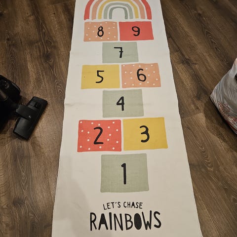 IKEA Paradis barneromsteppe i grått med nummerert hoppeparadisdesign. Teppe med fargerike tall og lekemotiv for innendørs bruk.