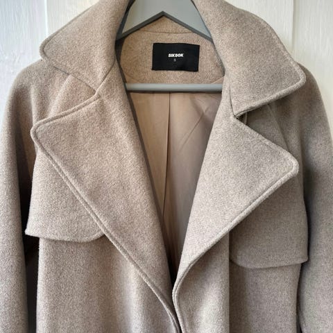 Bik Bok kåpe i oliven grønn farge, størrelse M for kvinner. Laget av en ullblanding som består av 50% ull og 50% polyester. Kåpen har knapper og belte i midjen, og er laget for tørrens. Materialet gir varme og komfort, egnet for bruk i kaldere vær.