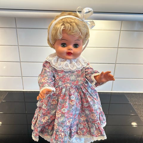 Dukke m hår, bevegelige øyevipper ("sovedukke") L: 50 cm. Alder ca 1970/80. Som ny, har aldri vært brukt av barn. Tilbehør: Masse klær + sovepose+seng (45x54 cm). Et uåpnet dukkeservice medfølger. Hentes Trondheim