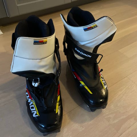 Skistøvler i str 43 selges. Kjøpte feil da disse ikke passer NN binding. Bredden på metallstangen foran er 25mm, og jeg regner med at disse passer Salomon binding.