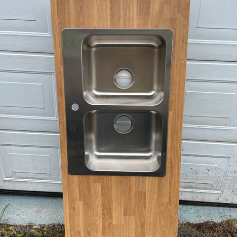 Plate i laminat. Platen er buet/ har slått seg litt. Kanskje mulig å rette litt med noen vinkler festet i skrog. Stor plate med hull for platetopp, 170x95 cm.