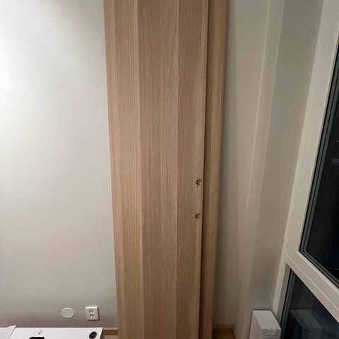 Fire skapdører til Pax skap, fra Ikea. Glanset overflate på to, speil på de to andre. Det ene speilet er delvis knust (se bilde), ser ut til at det går an å ta av speilene. Det ene håndtaket er løst, kun skruer som mangler, kan lett fikses. Uten hengsler Må hentes *samlet* på Siggerud.