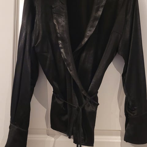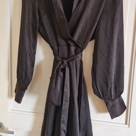 Satin-look, knyting i livet og fin drapering foran. Veldig flatterende modell.