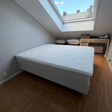 Sengen består av en base, en madrass og en overmadrass med quiltet overflate.