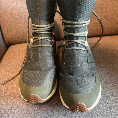 Viking barnesko i størrelse 34, unisex. Skoene er grønne med hvit såle og har snøring med strammesystem for enkel justering. Materialet er slitesterkt med goretex og egnet for aktiv bruk.