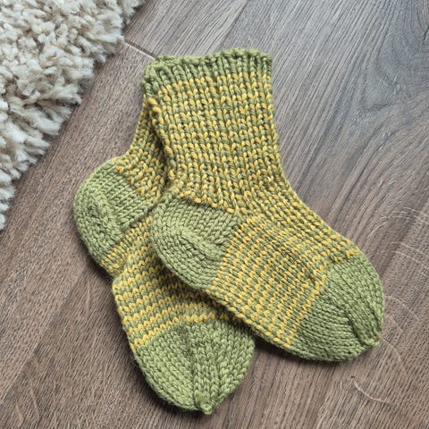 Sokker til barn i str. 22/23. Strikket med garnet SISU fra Sandnes. Lengde fot er 14 cm. Fargen er en slags gulfarge/hvit. Ved forsendelse, kjøper betaler porto.