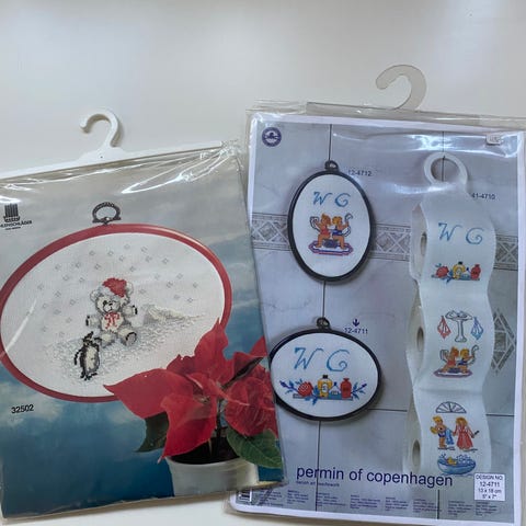 Selger tre helt nye broderisett, alle i original emballasje. Settene inneholder aida-stoff, mønster, garn og broderiramme.
