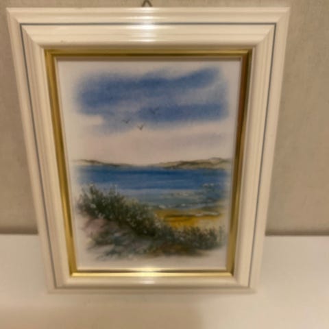 To innrammede kunstverk med motiv av en isbjørn og et fjellandskap. Begge malerier er plassert i gullfargede rammer. 150/stk. Mål 46x38