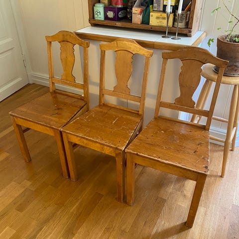 Den ene stolen er hel og fin. Kr 350.