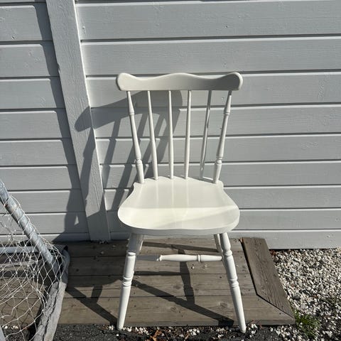 Den andre stolen har en knukket spile i ryggen (se bilde). Kr 150.