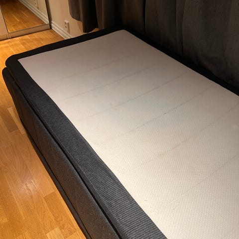 IKEA enkeltseng kjøpt i 2016 og pent brukt - har stått for det meste ubrukt i et gjesterom. God, fast Hövåg-madrass med springfjær og topp-kvalitets Tromsdalen-overmadrass med lateksfyll. Rammen og ribbebunn også fra IKEA. Rammen er furu og beiset i mørk brungrå. Den kan enkelt demonteres om nødvendig. Høyden til toppen av overmadrassen er 60cm, og til toppen av hodegavlen 91cm.