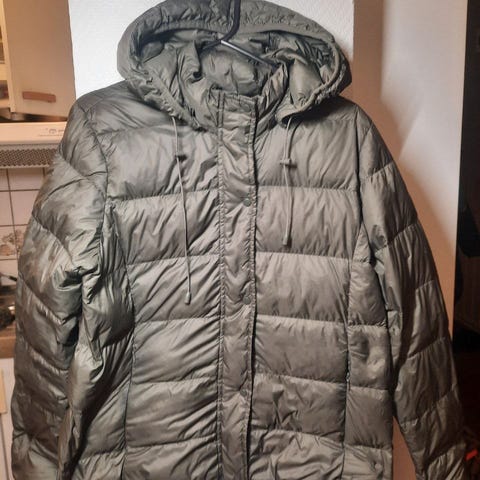 Jakken er grønn og laget av dun, som gir isolasjon og varme. Passer til utendørs bruk i kaldere vær.