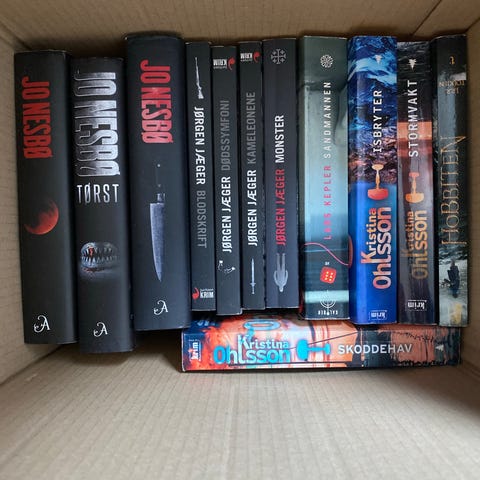 10,- kr pr bok. Sender ut handler over 50,-
