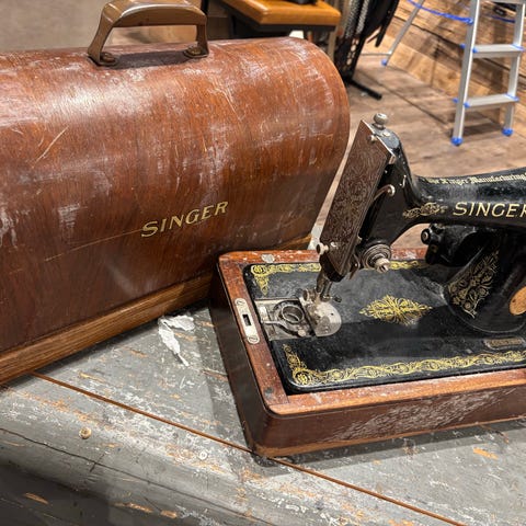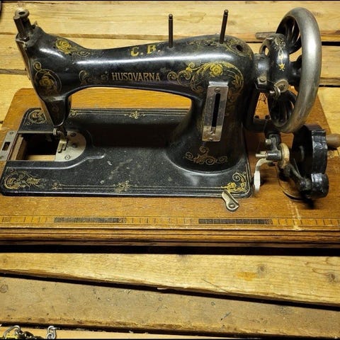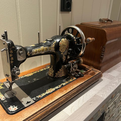 The sewing machine shows much wear from use through the ages, but has been in working order. Some mother of pearl inlay has been worn away or cracked.