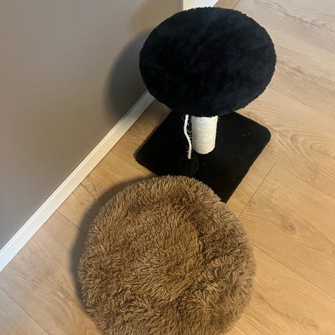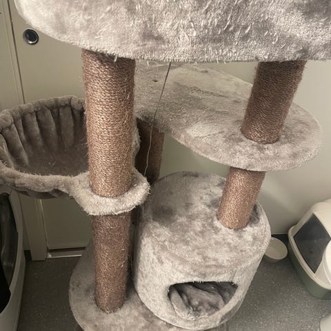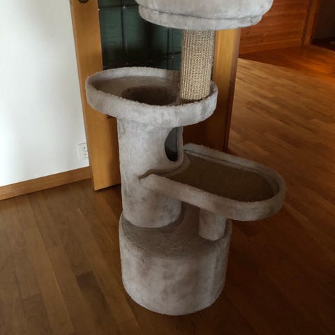 Fint lite kattetre med hengekøyeseng og krafsestolpe. Passer for en liten katt opp til 4 kg, eller kattunger, men hvis det plasseres mot veggen, passer det fint for en katt på 6 kg. Robust base. Jeg brukte det som et sekundært trinn opp til et større tre for unge katter.