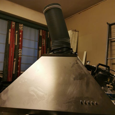 Ventilasjonsenhet i metall med fleksibel luftslange. Enheten er designet for å forbedre luftstrømmen i rom og kan monteres i tak. Den har ventilasjonsåpninger for luftutveksling og en solid metallkonstruksjon for holdbarhet.