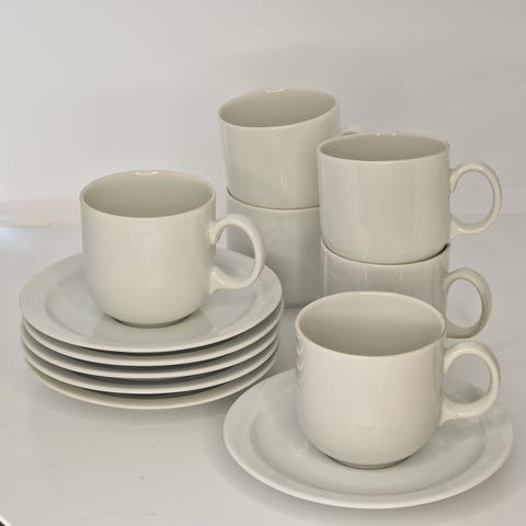 4 kopper med skål, 4 eggeglass og 2 teskjeer. Plast service.