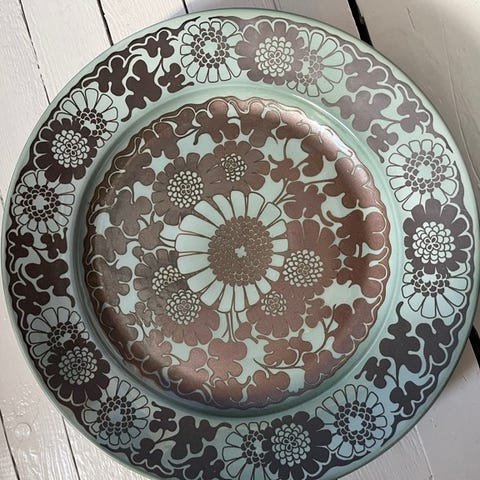 Passer fint som lite kakefat, fruktfat eller veggpynt med tallerkenhenger.