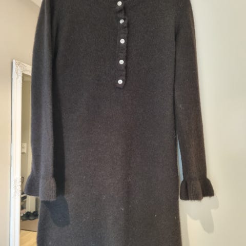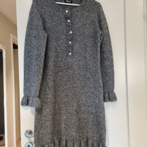 Svart strikkekjole med glittertråder fra Just Female. Modellbildene viser kjolen i mørk blå. Kjolen er pent og lite brukt.