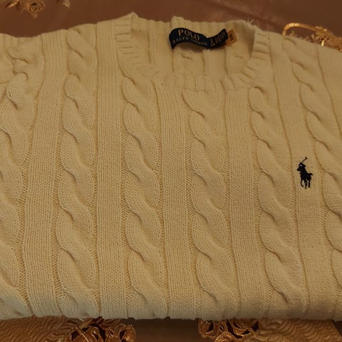Ralph Lauren Polo ullgenser i beige farge, størrelse S for menn. Genseren er laget av ullmateriale og har en flettet kabelstrikket design.