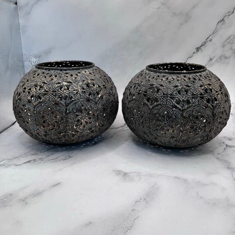 Blankt metall, veldig dekorative lykter og ekstra stor champagnekjøler. Kjølere. Er brukt som potteskjuler.