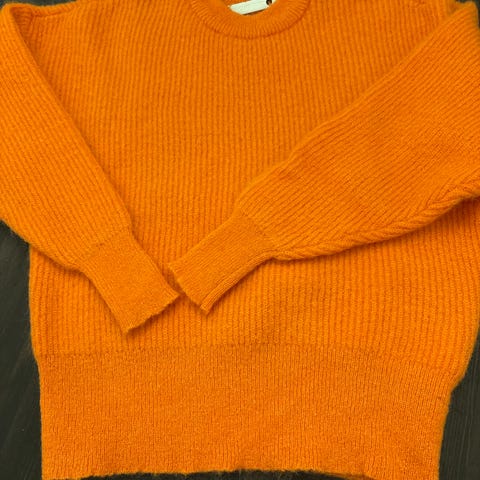 Selger en lekker genser i nydelig appelsin orange farge fordi den nå er for liten. Kul fasong, smal i torso med ballongermer. Fra Hm mohair edition. Kvalitet: 34% mohair, 34 % ull, 27% polyamid, 5 % elastan. Den er str 34, men er tøyelig så passer flere størrelser. Fargen synes best på siste bilde.