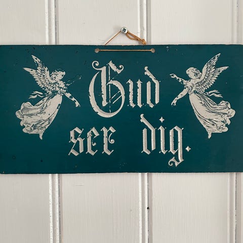 Gammelt skilt med teksten "Gud velsigne vort Hjem" i gotisk skrift.