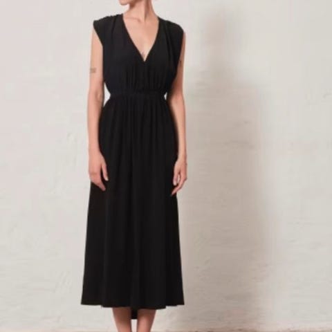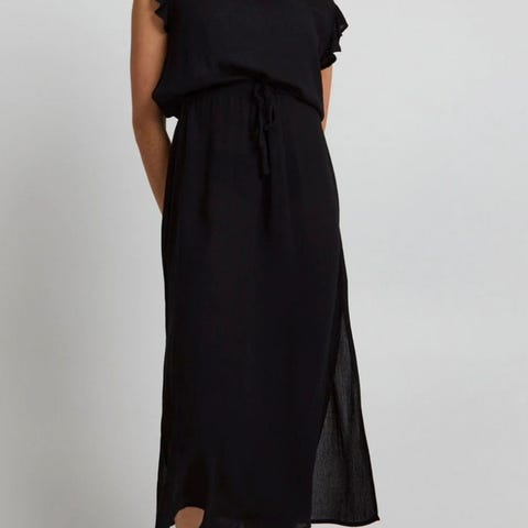 KappAhl hverdagskjole i størrelse XS, laget av linmateriale. Kjolen er svart og har en elastisk midje med snøring for justering. Den har en åpen ryggdetalj, lommer og korte ermer, egnet som en lett og luftig kjole for hverdagsbruk.
