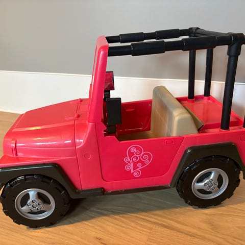 Our generation rød lekebil for barn, laget i plastmateriale. Bilen har et åpent design med to seter og sikkerhetsbur. Den er egnet for innendørs og utendørs lek.