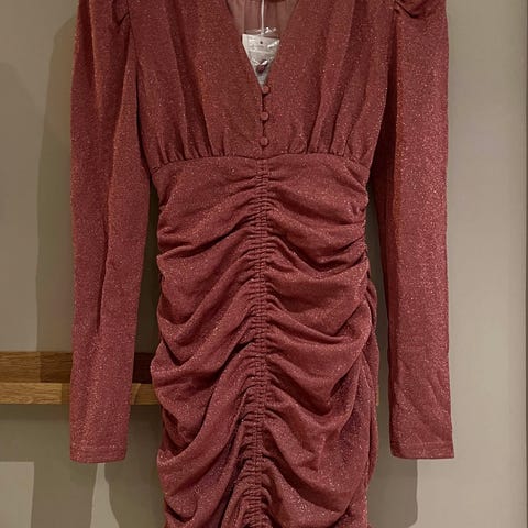 Eksklusiv glitterkjole fra Atelier Jad, kjøpt i Lyon. Kjolen er laget i Frankrike og har et nydelig metallisk skimmer som gir et elegant og festklart uttrykk. Puffede ermer og rynkedetalj foran skaper en flatterende silhuett.