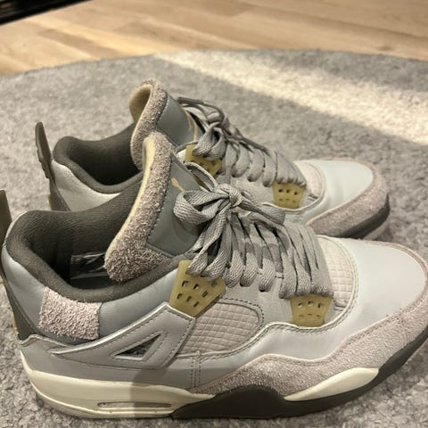 Air Jordan 4 Sneakers joggesko i størrelse 40,5. Fargene er hovedsakelig beige med detaljer i lysere nyanser. Skoene har en kombinasjon av materialer, inkludert semsket skinn og tekstil. Designet inkluderer den karakteristiske Air Jordan-logoen på hælen og tungen. Sålene viser noe bruk, men skoene er generelt i god stand. Egnet for daglig bruk og samling.