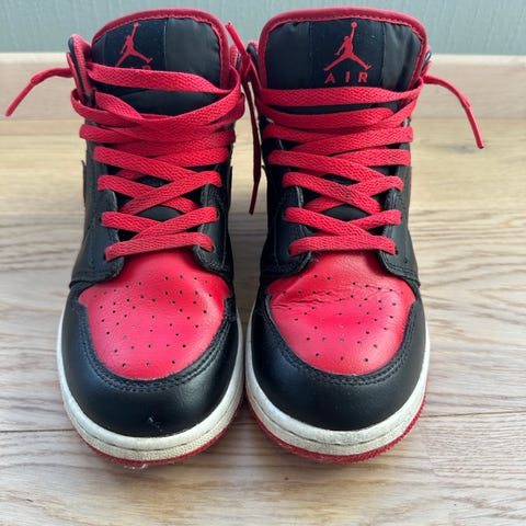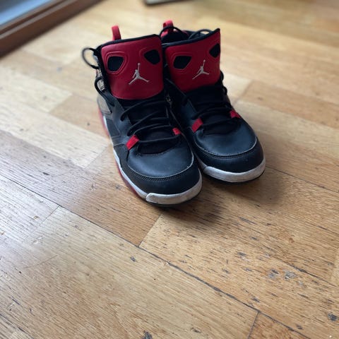 Nike Air Jordan barne sneakers i størrelse 38, designet for unisex bruk. Skoene har en kombinasjon av svart og grå farge, med røde detaljer på tungen. Materialet inkluderer tekstil og syntetiske elementer. Passer til daglig bruk og ulike aktiviteter.