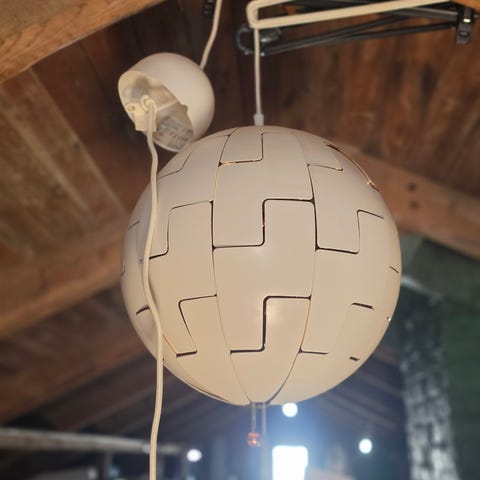 IKEA PS 2014 taklampe er inspirert av science fiction-filmer og ble en av vinnerne i den internasjonale designkonkurransen Red Dot Award. Endre formen og styrken på lyset ved å dra i snorene.