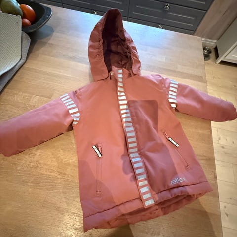 Reflex barnejakke i størrelse 98, designet for Den har hette og reflekser for økt synlighet. Jakken er egnet for bruk i kjøligere vær og gir komfort og beskyttelse. Kun brukt et par ganger og er vasket.