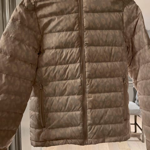 Line of Oslo dunjakke, modell Water Print, ny med lapp og oppbevaringspose. Jakken har en grå/beige farger med slangemønster. To lommer. Laget av polyester med 90% dunn og 10% fjær inne. Halsen er ganske stor og ermene er i 3/4 lengden så den passer best til bilkjøring.