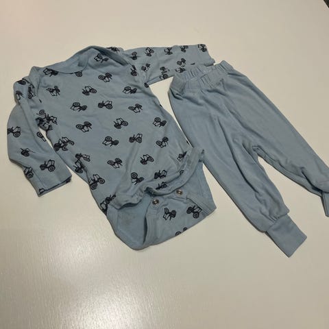 Lindex Barneklær Pyjamas i størrelse 92, laget av bomull. Pyjamasen har en grønn farge med traktormønster, egnet for barn.