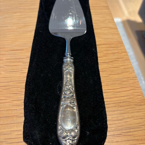 1 stk kakespade i sølv med dekorativt håndtak. Egnet for servering av kaker og bakverk.