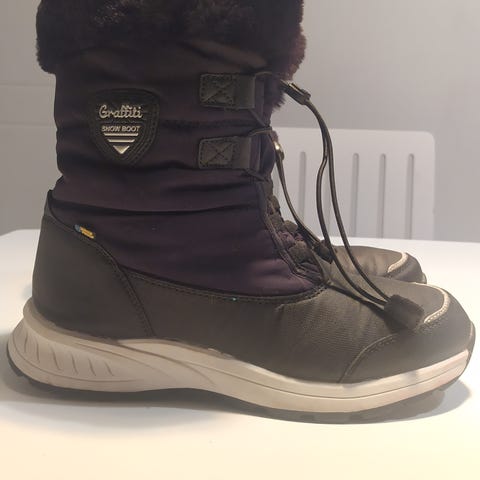 Viking barn vinterstøvler i størrelse 36, unisex. Støvlene er svarte og laget med vanntette materialer. De har en solid såle med godt grep, egnet for vinterbruk. Fôret inni støvlene gir varme og komfort under kalde forhold.