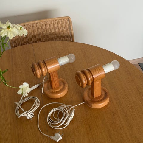 Svensk dreiet designlampe i furu fra 70-tallet. I veldig fin stand og funker som den skal.