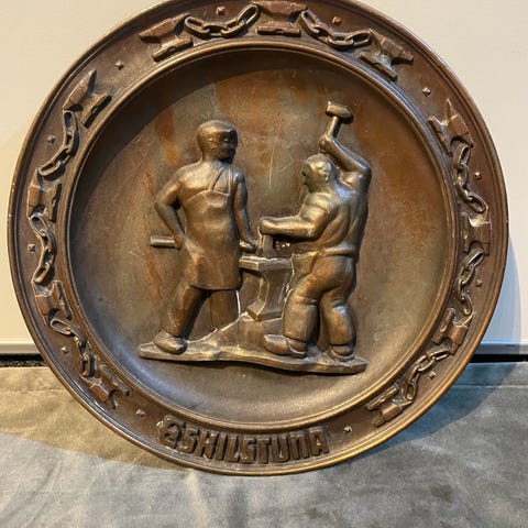 Dette er et kobberrelieff som viser en mann som bærer en ljå og rake.