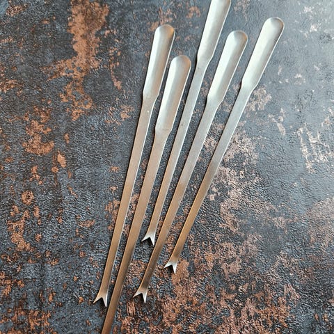 Ti fine italienske coldgafler/minispydgafler i rustfritt stål med vannbestandig trehåndtak.