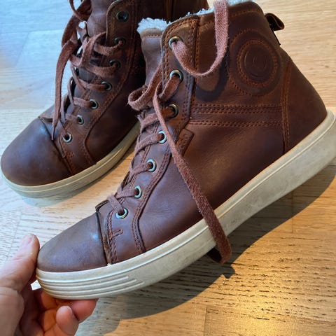 Ecco vinterstøvler i størrelse 40, blå farge med Gore-Tex membran. Støvlene har borrelås for enkel justering og lukking. Materialet kombinerer tekstil og lær, med en slitesterk yttersåle. Egnet for bruk i kalde og våte forhold.