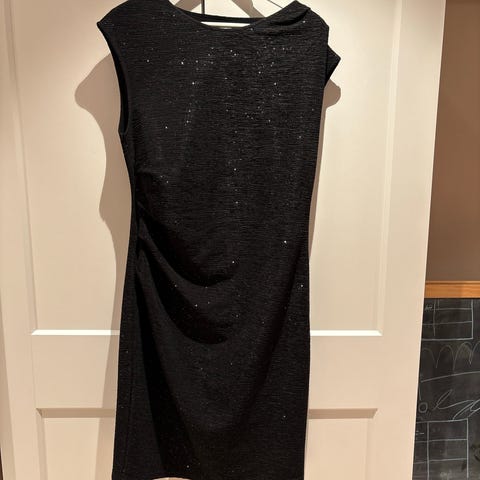 Riccovero selskapskjole i størrelse 42. Kjolen er liten i størrelse, tilsvarer 38/40. Kjolen er svart og laget av en blanding av ull (4 % elastan, 43 % virgin wool) og polyester (53 %). Foring består av 100 % polyester. Brukt kun få ganger. Røyk og dyrefri.